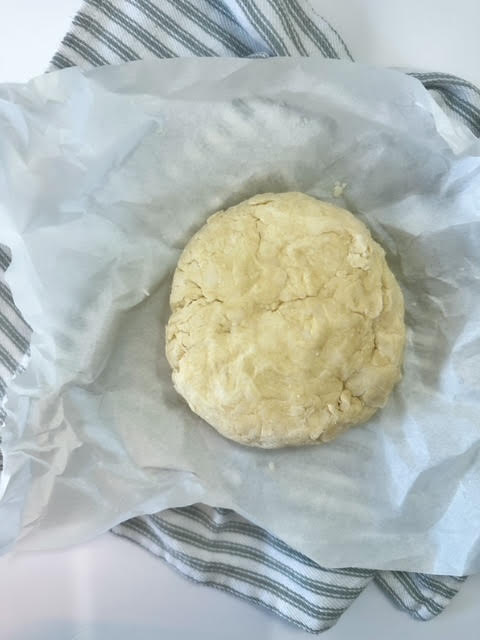 Gently form dough into a round disk, do not knead, just press it together. Evenly divide in half, form into balls and flatten into discs. Wrap each dough in plastic wrap or parchment paper and chill in the fridge for 30 minutes before using.Â