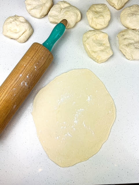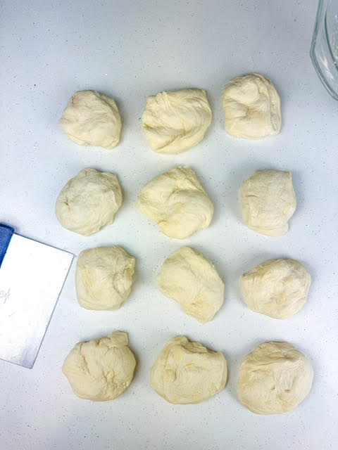 After rising transfer dough to a lightly floured surface again, divide into 8 large pieces or 12 smaller pieces.
